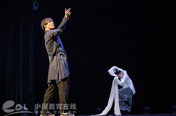 部分学员还做了现代舞个人展示。黄德俊动人的身姿与悠扬的旋律融为一体,展现了一个孤独男子思念死去爱犬的痛苦之情;郑超华的独舞《再见吧,曾经》,用舞蹈表现出对过去的怀念和珍惜,对未来的希望和信心;左旭东的独舞《禅定》,舞蹈中含有古典元素,一身僧侣打扮,为观众呈现出一幅淡然清幽的寺院生活,观其舞,内心得以平静,心灵得以释放;刘福洋和高谷音伴着箫声出场,他们细碎的舞步,轻云般慢移,旋风般急转,给人美的感觉;朱轩和樊一丁带来《鸿雁?迹》,两只孤独的大雁,在空中展翅飞翔,秋去南方,春来北方,一份浓浓思乡情,一丝淡淡的忧伤,弥漫着整个舞台。