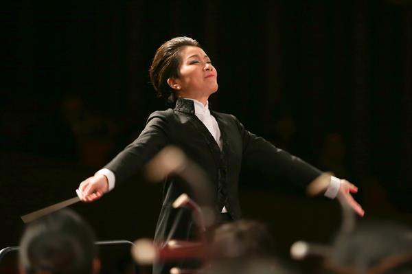 听,海螺声中,排鼓奏出仿似渔船开动的声音,鼓声铿锵有力、充满朝气,锣鼓喧天、琴瑟交织,《渔舟凯歌》正气势轩昂地扑面而来,色彩缤纷、热情豪放的快板旋律奏响整个音乐厅,勾画出一幅渔民扬帆出海、撒网捕鱼及与海洋搏斗的热情劳动情景。作为浙江音乐学院国乐团常任指挥,吴强挥舞着指挥棒,那自如潇洒、张弛有度的指挥风格,也瞬间迷倒台下观众一片。