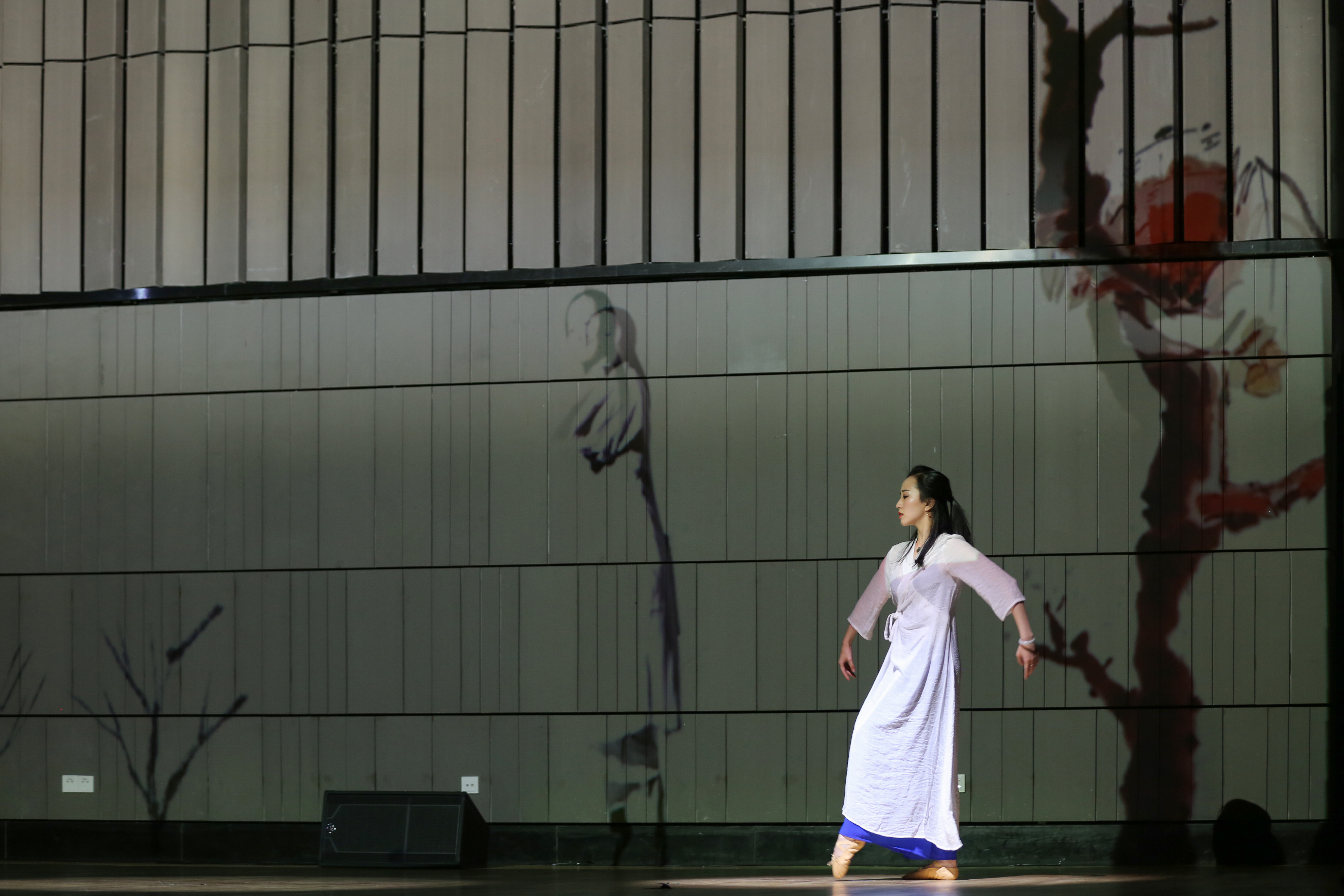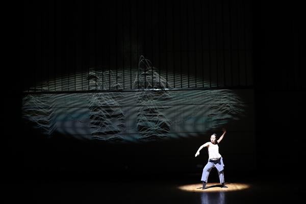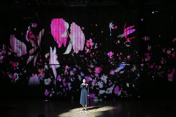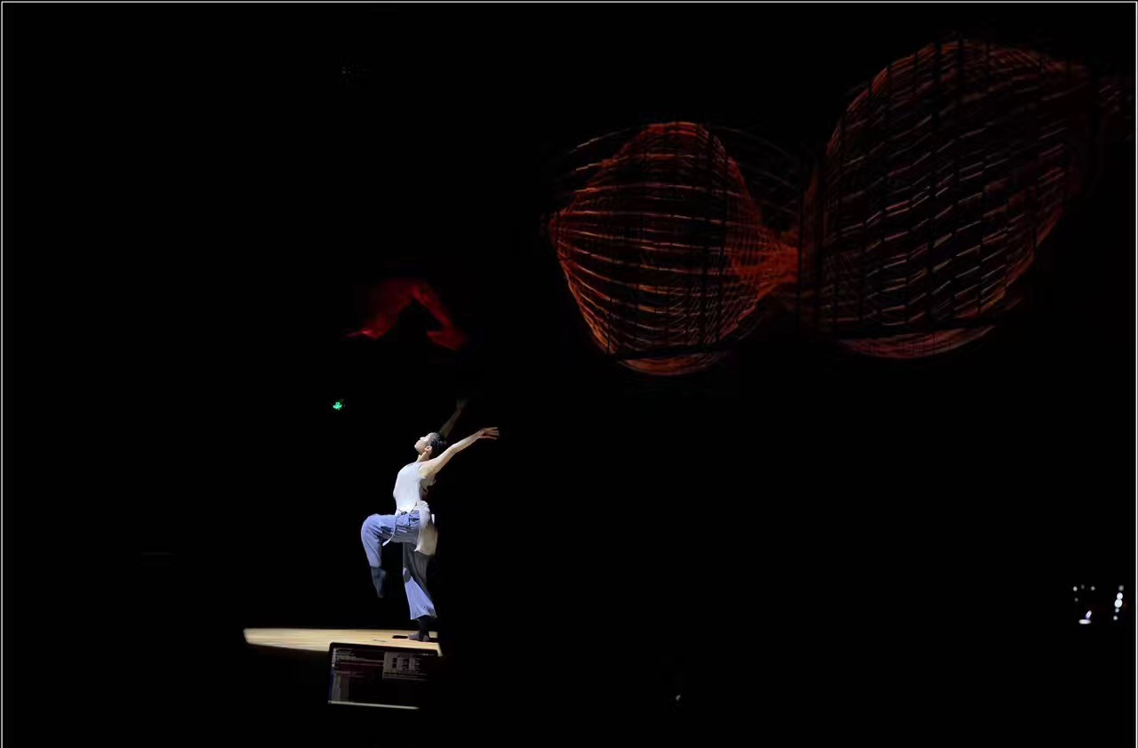 整场音乐会在毫无灯光效果的漆黑环境中进行,一束追光静静地打下舞台中央,琴弦拨起,凹字形的舞台墙面投影出含有戏曲元素的动画效果,一段由杨磊创作的《戏梦》缓缓传入耳畔。该曲由听园、叫画、别姬、落花四个段落组成,杨磊从声音和新媒体视觉角度出发,重表现而轻叙事,有意识地选择昆曲、京剧、越剧中几个经典的折子作为基本素材,对传统词曲中的行头做不同的处理和夸大,展现不同的表现力。空寂缥缈、清远萧疏,伴着阵阵箫声,由段瑞雷创作的《逸气》如空远荒冷之气,吹入听众的内心,听者仿佛身处仙境,有飘然若仙之感。京剧《空城计》这句经典唱句“我正在城楼观山景”从多声道依次跳出,和着大提琴低沉压抑的声音,一场孔明城头抚琴智斗司马懿的场面映入眼帘。如何通过音乐体现《空城计》中“虚而示虚,疑中生疑”的心理战,李秋筱用“缓中有急,急中带缓”的方式,以古琴音色为主,用大提琴滑奏与拨奏的方式来效仿古琴音乐,展现大军压敌的紧迫感,听此曲别有一番韵味。“一簇焰火,舞畲人的愿;一幅祖国,载山哈的魂……”姜超迁创作的《畲人愿》以畲族山歌为音频素材,依托粒子合成器等声音技术处理手段将具象化的畲族人声素材抽象化。伴着一声清脆的畲族山歌,舞者跳着轻盈柔美的动作展现在舞台中央,一种浓浓的畲乡情展露无遗。一把白绸伞贯穿音乐始终,为民族女高音、二胡、大提琴、钢琴与电子音乐而作的作品《寄》,由黄晓东创作,他取材苏轼的《怀西湖寄晁美叔同年》,通过断桥、书画等画面写意地表达对古诗诗意赋以现代意义的理解。一曲由沈佶创作的《飞花流去》,唱出了人世间的悲欢离合,四周花瓣萦绕,空灵的演唱,蕴含着一股无奈与哀思。该作品歌词选用宋词词牌《雨霖铃》,通过重新谱曲,并用Kontakt采样器中的编辑功能对采样进行修改,从而获得全新的音响,是对经典音色在通俗歌曲中使用的一次新尝试。李秋筱创作的《访妙玉乞红梅》是一首为当代舞、视频影像与电子音乐而作的曲子。整部作品的音乐音响风格以空灵为主,耳边不时传来的钟声寓意着妙玉的佛门身世,曲中用古琴表达出妙玉的“气质美如兰,才华馥比仙”。曲子的绝妙之处还在于融入了越剧旦角的唱段与念白。