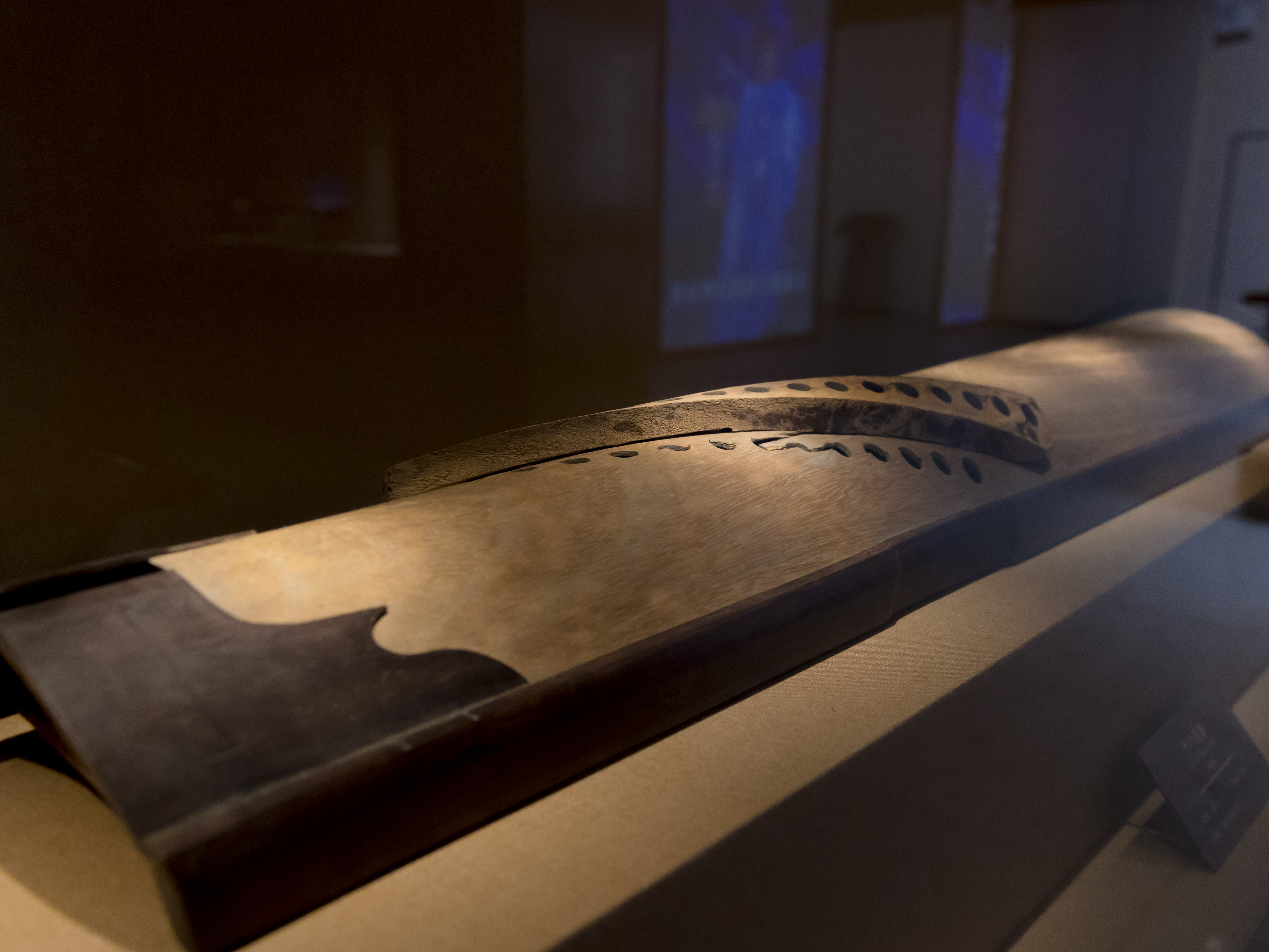 从陶埙、陶鼓、骨哨、骨笛等远古部落的原始乐器,到编钟、编磬这类体制严整的礼乐重器,在“历史回声”展区里,参观者能从这小小的百余方展区中看到古代音乐千年历史的传承。“la dol mi sol”清脆悦耳的编钟声响起,那富有灵魂的声音,缓缓地流淌出中国古代音乐迷人的韵味。“这件陈列品晋侯苏编钟全套共16枚,钟上铭文为利器刻凿而成,是一套改写中国冶金史的宝贵资料。它随葬于山西曲沃北赵村晋侯墓地第七代晋侯稣的墓中而得名。”馆长孟凡玉向参观者娓娓道来。