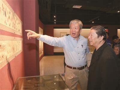 近日,经过一年多筹划与建设的“敦煌乐舞——常书鸿、李承仙丝绸之路乐舞艺术展厅”在浙江音乐学院开馆,展出了敦煌石窟壁画、雕塑中的乐舞内容等,面向学生和市民永久开放。图为常书鸿之子常嘉煌(左)向嘉宾介绍作品。