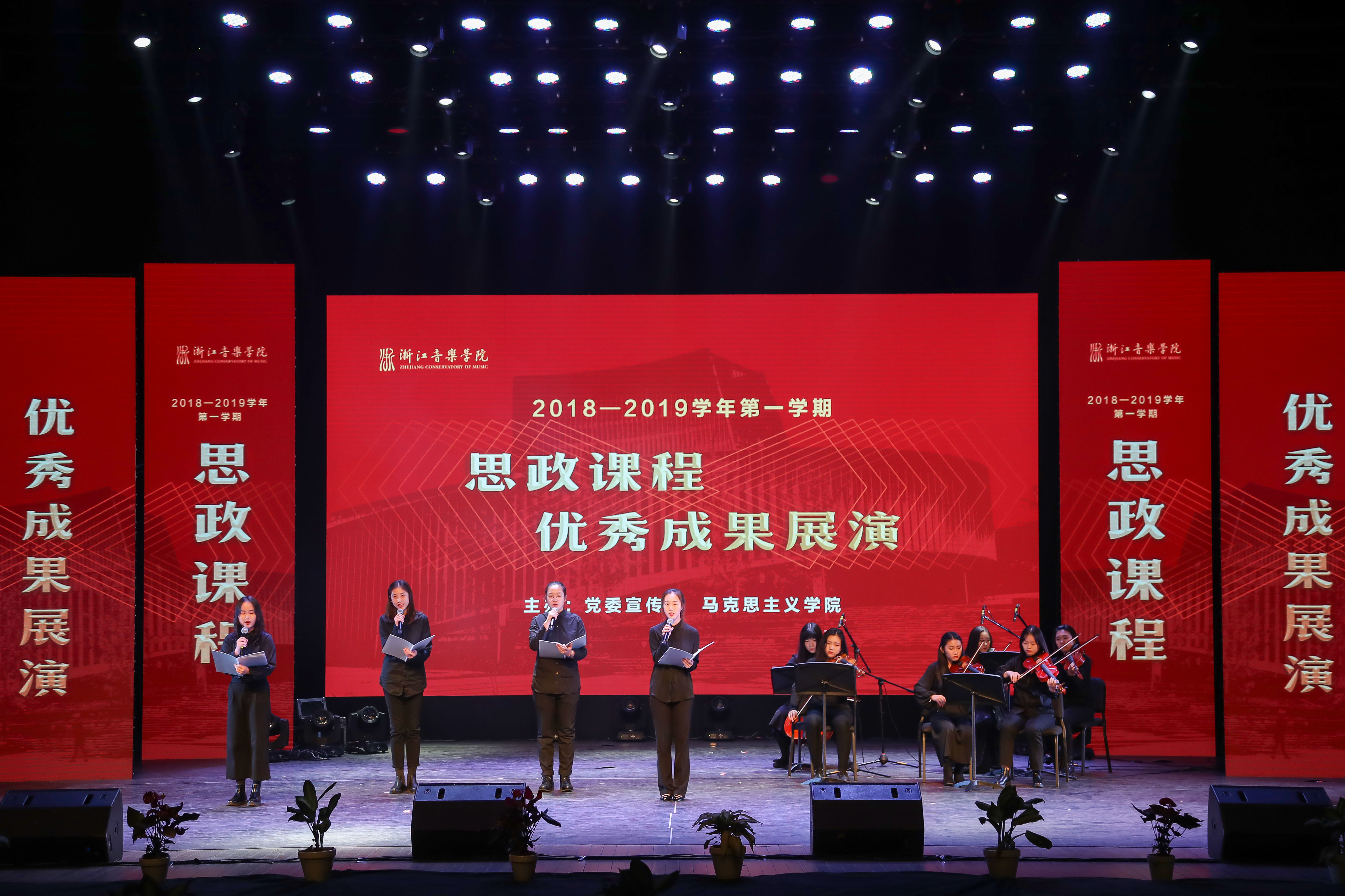 12月20日晚,由浙江音乐学院党委宣传部、马克思主义学院、教务处和艺术实践处联合举办的2018-2019学年第一学期思政课程优秀成果展演在学院综艺楼小剧场隆重举行。这场充满艺术灵感与丰富育人内涵的展演节目皆由学院本学期修读思想政治理论课的同学们自编自创自演,他们用音乐的旋律、舞蹈的柔美、语言的力量,以鲜活生动、寓教于乐的汇报形式,表达了学生们在思想政治理论课学习中的所感所想所获。