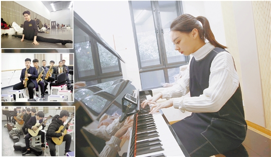 在浙音校考的日子,能很容易分辨出这些不同专业的学生。背着大包小包各种形状乐器的,通常是器乐演奏专业的考生;舞蹈专业的女生大多梳着丸子头,就算穿着臃肿的羽绒服,还是老远就能看到她们笔挺的腰,给她们服务的师兄师姐,也是整个校园里颜值最高的群体。