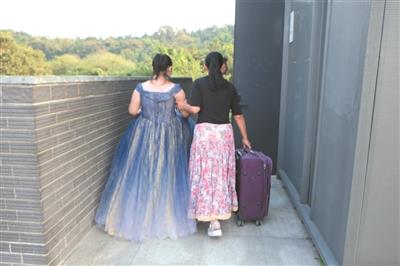 王怡文从报告厅旁的琴房换好一身蓝色礼服出来,脸上是妈妈给化的精致妆容。妈妈一手牵着女儿,一手拖着一个紫色行李箱,看着女儿笑着说:“化完妆穿上礼服,我们妞也是大美人!”