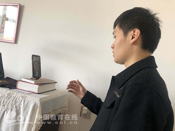 “何处望神州?满眼风光北固楼。千古兴亡多少事?悠悠。”美妙动听的歌声在研一学生毛程远的房间流淌,此时的他正对着电脑,放着伴奏,演唱着歌曲《南乡子·登京口北固亭怀古》,而电脑的另一端,他的声乐老师李琳、艺术指导老师朱雨龙正认真仔细地聆听着他的演唱。这是一堂浙江音乐学院声乐歌剧系普通的声乐艺术与艺术指导线上课程。课程中,两位老师从呼吸支持、咬字吐字、逻辑重音、音乐风格、节奏把握等各个维度做了全方位指导,“二对一”的授课方式让毛程远的家人看到了老师们精湛的水准和用心的指导。