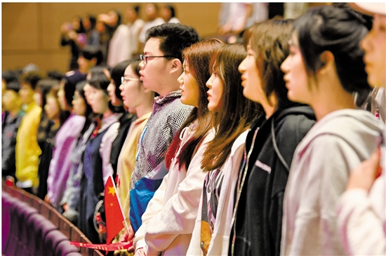 于海带领浙江音乐学院师生齐唱《义勇军进行曲》。