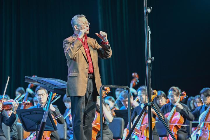 国家一级指挥于海为浙音师生在音乐厅里上思政课。