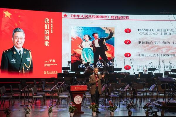 “我们的国歌有84个字,37个小节,标准时长是46秒,这是每一个中国人都应该牢记的。”站在讲台上,年过六旬的于海依然身姿挺拔。作为军人艺术家、“国歌守护人”,于海老师曾担任国庆50周年、60周年庆祝活动千人联合军乐团总指挥,北京奥运会开幕式中国人民解放军军乐团指挥,2015年“九三大阅兵”千人合唱团团长兼总指挥等。他从国歌的概念、历史上的“国歌”和重要地位讲起,通过音乐播放和精彩讲述相结合的方式,生动讲述了中外国歌的历史和典故,并通过分享《义勇军进行曲》创作历程和背后故事,展现了国歌作为国家象征、家国情怀内容的神圣使命和重要意义。随后,他从专业角度分析了《义勇军进行曲》的词曲特点,深刻指出了“我们的国歌是世界上最好的国歌”这一鲜明观点,重申了国歌教育的重要意义,并分享了自己连续10年为国歌立法呈交提案的感人经历,充分展现了一个新时代艺术家的家国情怀和责任担当,对广大青年学生进行一场深刻的爱国主义教育。