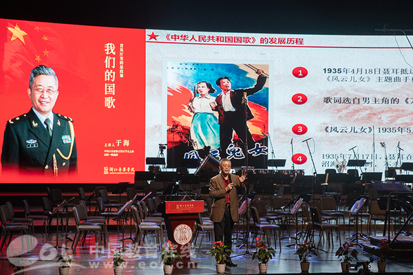 “我们的国歌有84个字,37个小节,标准时长是46秒,这是每一个中国人都应该牢记的。”站在讲台上,年过六旬的于海依然身姿挺拔。作为军人艺术家、“国歌守护人”,于海老师曾担任国庆50周年、60周年庆祝活动千人联合军乐团总指挥,北京奥运会开幕式中国人民解放军军乐团指挥,2015年“九三大阅兵”千人合唱团团长兼总指挥等。他从国歌的概念、历史上的“国歌”和重要地位讲起,通过音乐播放和精彩讲述相结合的方式,生动讲述了中外国歌的历史和典故,并通过分享《义勇军进行曲》创作历程和背后故事,展现了国歌作为国家象征、家国情怀内容的神圣使命和重要意义。随后,他从专业角度分析了《义勇军进行曲》的词曲特点,深刻指出了“我们的国歌是世界上最好的国歌”这一鲜明观点,重申了国歌教育的重要意义,并分享了自己连续10年为国歌立法呈交提案的感人经历,充分展现了一个新时代艺术家的家国情怀和责任担当,对广大青年学生进行一场深刻的爱国主义教育。