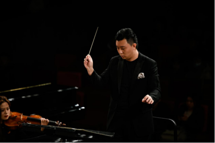 下半场的管弦乐作品是音乐会的重头戏。其中张莹的《云溪画境》(为管弦乐队而作,2019)是2019年浙江省文化艺术发展基金资助项目。全曲共三个乐章,各有标题,分别为晨钟、云水间、旋舞。乐曲以庄重的五度音响开始,但时而出现的同音反复和半音进行又令其平添了一些诡秘之感,随着音响的逐渐饱满,音乐的戏剧张力渐次加强而后爆发。顺势进入分别以管钟及颤音琴接着铜管组模仿钟声的两个阶段,最后在“钟鸣”声的逐渐消散中结束乐章。当进行至第二乐章《云水间》时,旋律一改《晨钟》中的庄重与神秘感,变得十分抒情且具有歌唱性。在此作者采用浙江民歌“采茶调”的旋律为素材,在将其打碎后掩藏在丰富的音响中,五声化的旋律若隐若现,每当听众似乎要顺接着旋律猜测音乐该通往何方时,随之出现的音响却又总出乎人意料。终于在乐章后面,被打碎的民歌旋律才汇聚在一起,唱完这一曲采茶调。第三乐章《旋舞》更为有趣,作者将杭州转塘地区的民间舞蹈上泗竹马舞的节奏融入音乐中,在各个声部模仿展开,越发热烈,最后在一个极强力度的齐奏中戛然而止。《云溪画境》以极其精致的方式在三个乐章中分别运用了三种鲜明的杭州地区特色音乐素材,这些素材以或明显或隐晦的方式散落其中,使作品具有了独特的地方色彩,呈现出的朦胧音色就如梦幻般迷人。