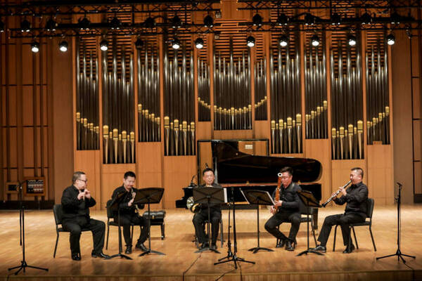 乐队学院、室内乐学院学子率先奏响了弦乐四重奏《瑶族舞曲》、木管五重奏《唱支山歌给党听》;乐队学院青年指挥胡星宇执棒学院交响管乐团,演奏了青春洋溢、热情似火的《茉莉花香云天外》《我的祖国》《情热大陆》等管乐团经典。当晚标准音乐厅上演 “红色经典——全国11所音乐学院交流音乐会”更是好戏连台,各音乐学院推出最强阵容,由48位专家联袂,以多样化的室内乐组合精彩演绎了艺术家心中的红色经典。音乐会开场由浙江音乐学院管弦系主任单簧管教授董德君与四川音乐学院、沈阳音乐学院、天津音乐学院、西安音乐学院等六位教授演奏了《三个小伙伴》,趣味横生的精彩演绎使现场气氛瞬间活跃。