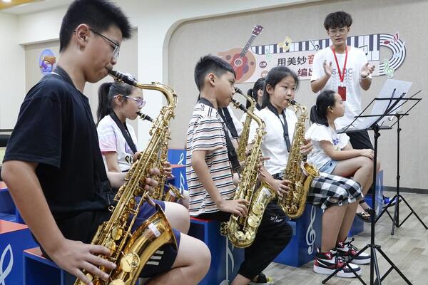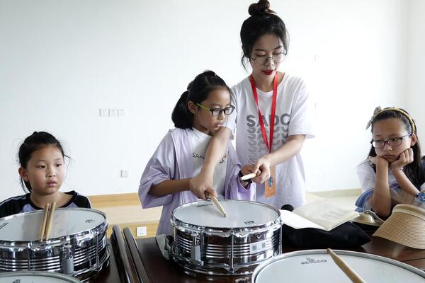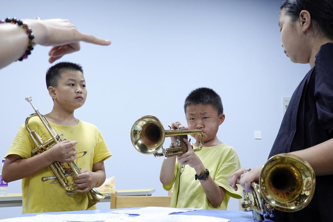 今天(7月14日),在嘉兴市秀洲区王店镇建设中心小学,来自浙江音乐学院“快乐音乐教室”暑期公益实践活动的大学生志愿者们教乡村学生演奏乐器。本次公益活动为期9天,大学生志愿者们在学校打地铺,为乡村孩子们带来西洋乐器教学、基础乐理、音乐赏析、手工劳作、心理团辅等课程。