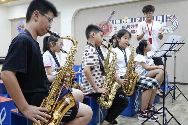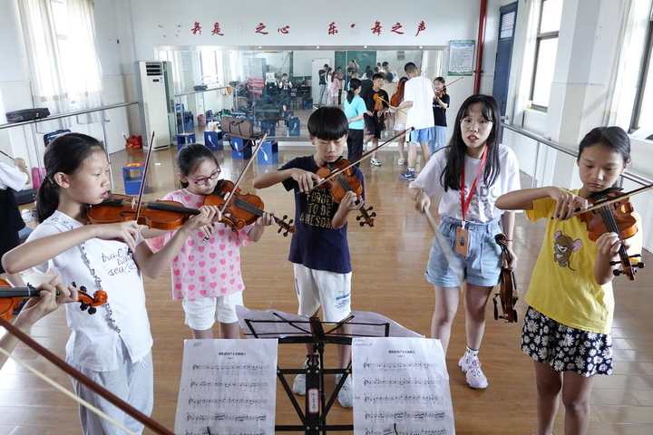 7月14日,在嘉兴市秀洲区王店镇建设中心小学,来自浙江音乐学院“快乐音乐教室”暑期公益实践活动的大学生志愿者们教乡村学生演奏乐器。本次公益活动为期9天,大学生志愿者们在学校打地铺,为乡村孩子们带来西洋乐器教学、基础乐理、音乐赏析、手工劳作、心理团辅等课程。