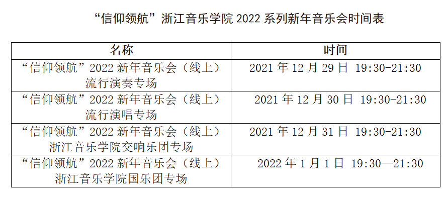 岁末将至,万象始新。2021年12月29日至2022年1月1日19:30至21:30,浙江音乐学院“信仰领航”2022系列新年音乐会将在线上举办。
