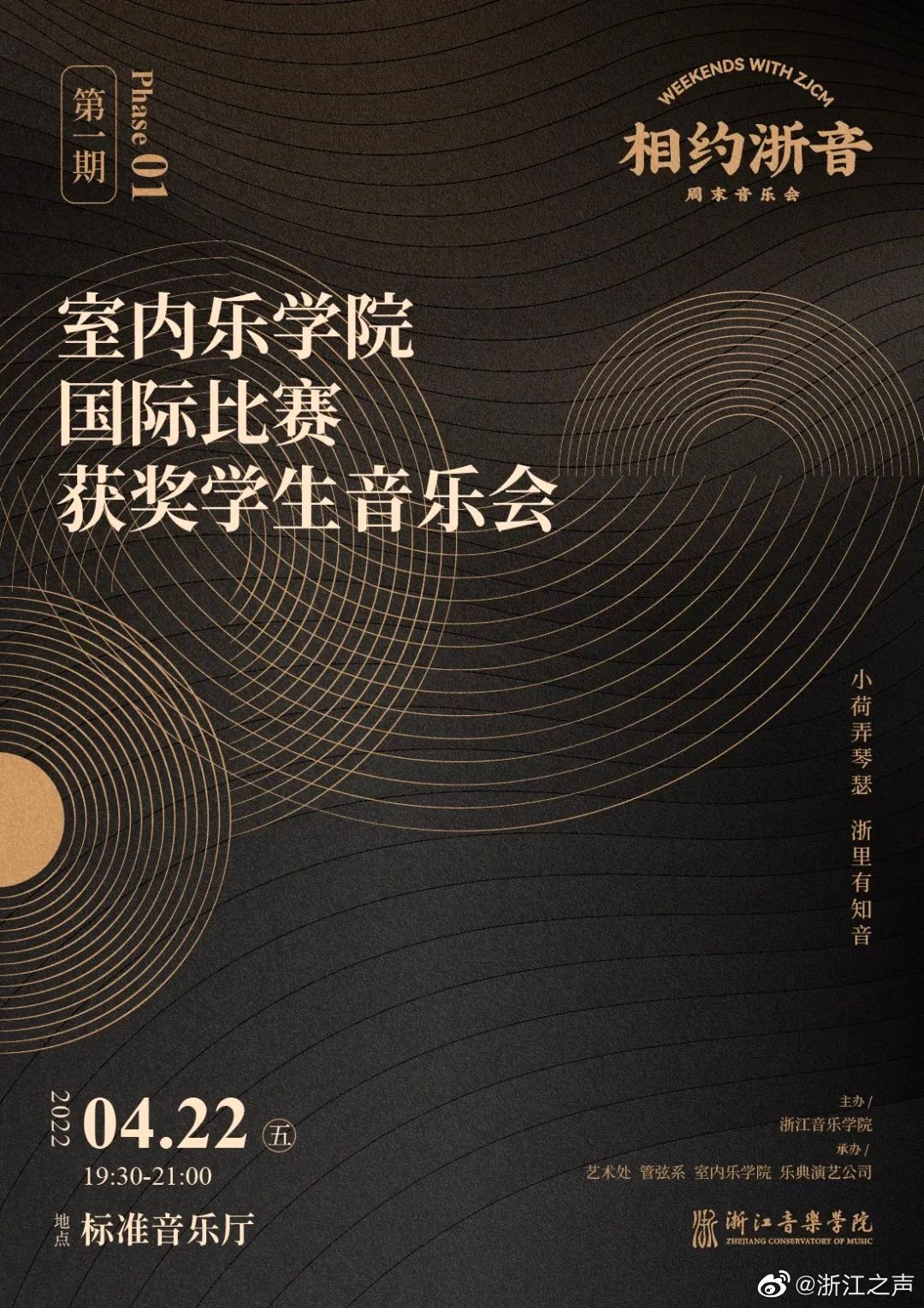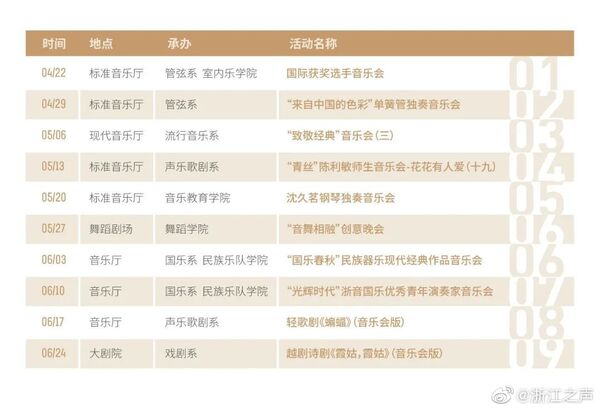 “相约浙音”周末音乐会系列是浙江音乐学院倾力打造的惠民文化品牌。浙音将在现有演出中优中选优,精心遴选包括声乐、器乐、舞蹈、戏剧等艺术门类的音乐会及演出剧目,在每周五晚上 7:30 - 9:00 面向公众上演。