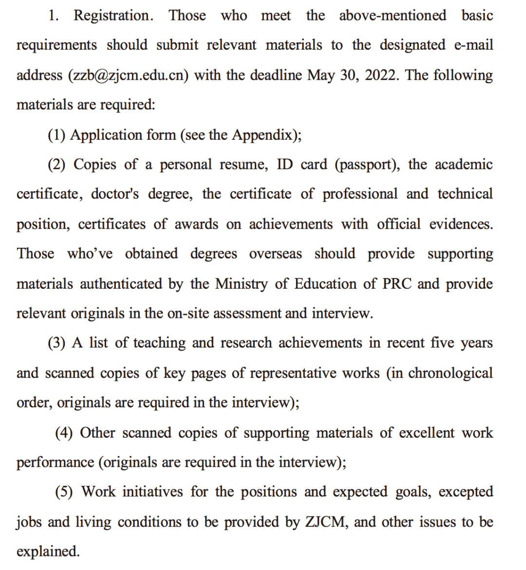 1.报名。符合应聘条件者,自公告发布之日起至2022年5月30日,报送相关材料发送到学校指定邮箱zzb@zjcm.edu.cn。需提供以下材料: