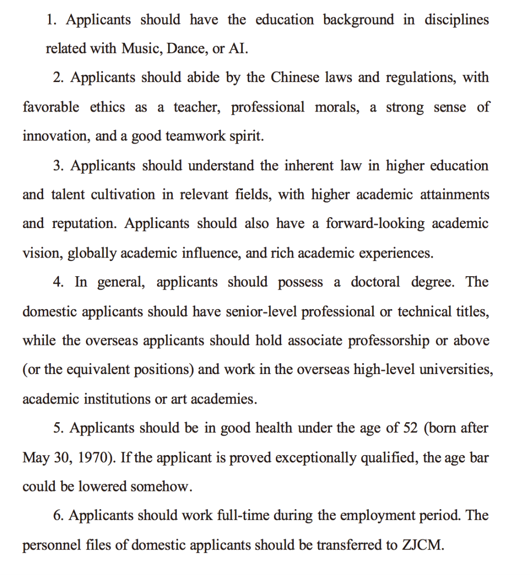 4.一般应具有博士学位,国内应聘者应具有正高级专业技术职务,国(境)外应聘者应具有海外高水平大学、学术机构、艺术院团副高级及以上职称或相当层次职务;