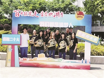 本次活动以百年团史为主线,突出浙音专业优势。当天,浙音学子带来了器乐演奏、诗歌朗诵、音乐思政微课等丰富多彩的活动,第十三届金钟奖得主王博同学演唱了《吊吴淞》。与此同时,还举行了思政社团“青年讲习所”授牌成立仪式。在校园的各个角落,学生们以快闪的形式演绎了原创圆号重奏作品《五四青年风》、原创合唱音乐剧《天黑请闭眼》;学院团委在校园内设置了“青春助力梦想”互动装置,同学们纷纷写下自己的青春誓言。此外,浙音还应邀参加由人民日报和哔哩哔哩联合发起的百校联动翻唱歌曲《少年》的活动,传承五四精神,展现青年作为,共庆建团百年,共赴美好新时代。