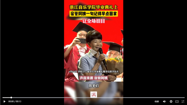 浙江新闻视频号:“早点回家!”6月24日上午,浙江音乐学院2022届学生毕业典礼上,宿管阿姨真情流露,台下毕业生泪目。