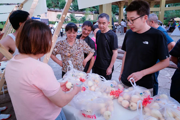 歌声嘹亮,广场上的乡村文艺市集更是烟火气十足。乡野美食长廊、宋韵雅集的8个摊位前,不少游客购买水蜜桃、高山蔬菜、笋干等土特产品。七里乡治岭村村民徐建富带来自家种植的100斤水蜜桃,不一会儿就被一抢而空。