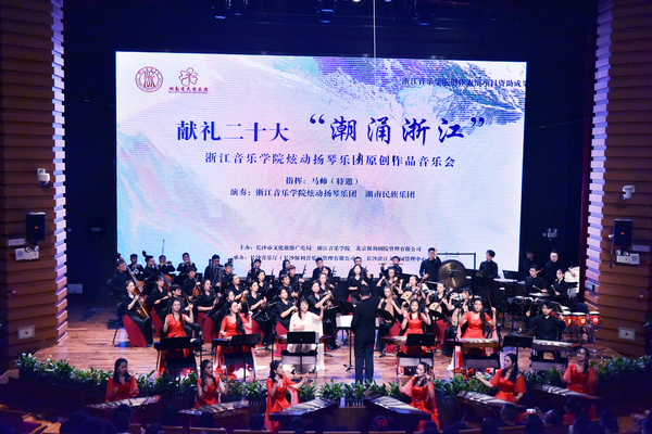 当晚,献礼二十大 “潮涌浙江”——浙江音乐学院炫动扬琴乐团原创作品音乐会在长沙音乐厅惊艳亮相,由浙江音乐学院炫动扬琴乐团与湖南民族乐团联袂演出,中央音乐学院青年指挥家马帅担任指挥。本次演出的所有曲目均为知名作曲家、浙江音乐学院作曲与指挥系副教授王云飞委约创作,借助带有浙江气质的诗书画意象,展现浙江的深厚底蕴和发展活力。