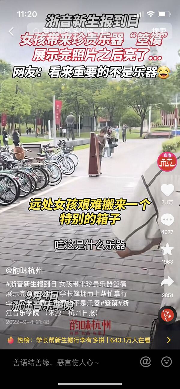 韵味杭州:浙音新生报到日 女孩带来珍贵乐器“箜篌”
