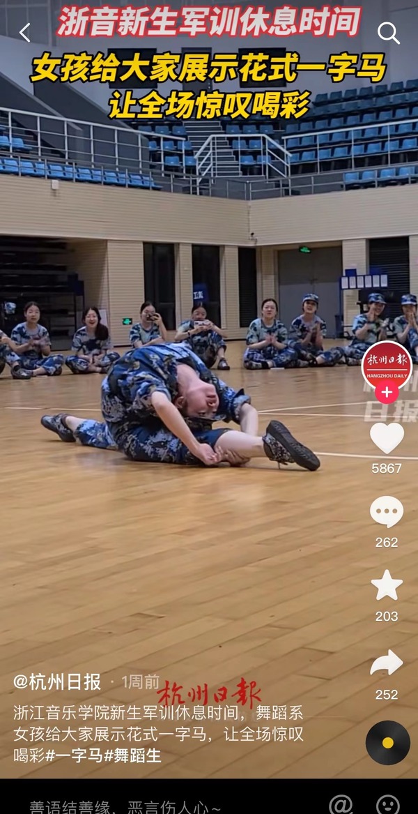 杭州日报:浙江音乐学院新生军训休息时间 舞蹈系女孩给大家展示花式一字马让全场惊叹喝彩