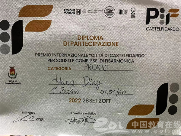 中国教育在线:浙音学子荣获意大利卡斯特费达多国际手风琴大赛冠军
