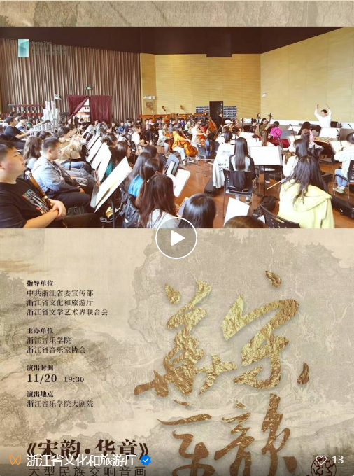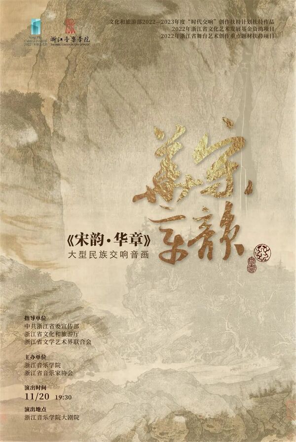 11月20日,国内首部以宋韵主题作为创作动机的大型民族交响音乐作品《宋韵·华章》,在浙江音乐学院大剧院隆重上演。