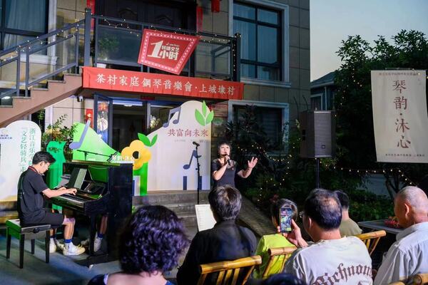 5月19日晚,暮色笼罩在茶园,一场浪漫的钢琴音乐会,在杭州市转塘街道上城埭村的一间庭院里启幕。在充满家庭氛围的庭院内,浙江音乐学院钢琴系“文艺轻骑兵”,将高雅艺术送到村民群众身边,与上城埭再次携手共赴这场“共富”之约。