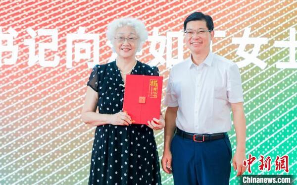 图为浙江音乐学院党委书记干武东向施光南夫人洪如丁颁发捐赠证书