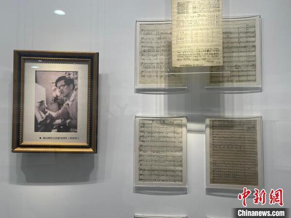 图为施光南音乐艺术馆中展示的施光南照片及其创作手稿
