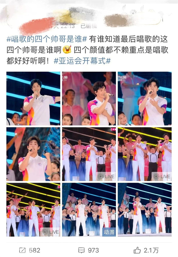 开幕式结束后,“唱歌的四个帅哥是谁”的话题冲上了热搜第一。