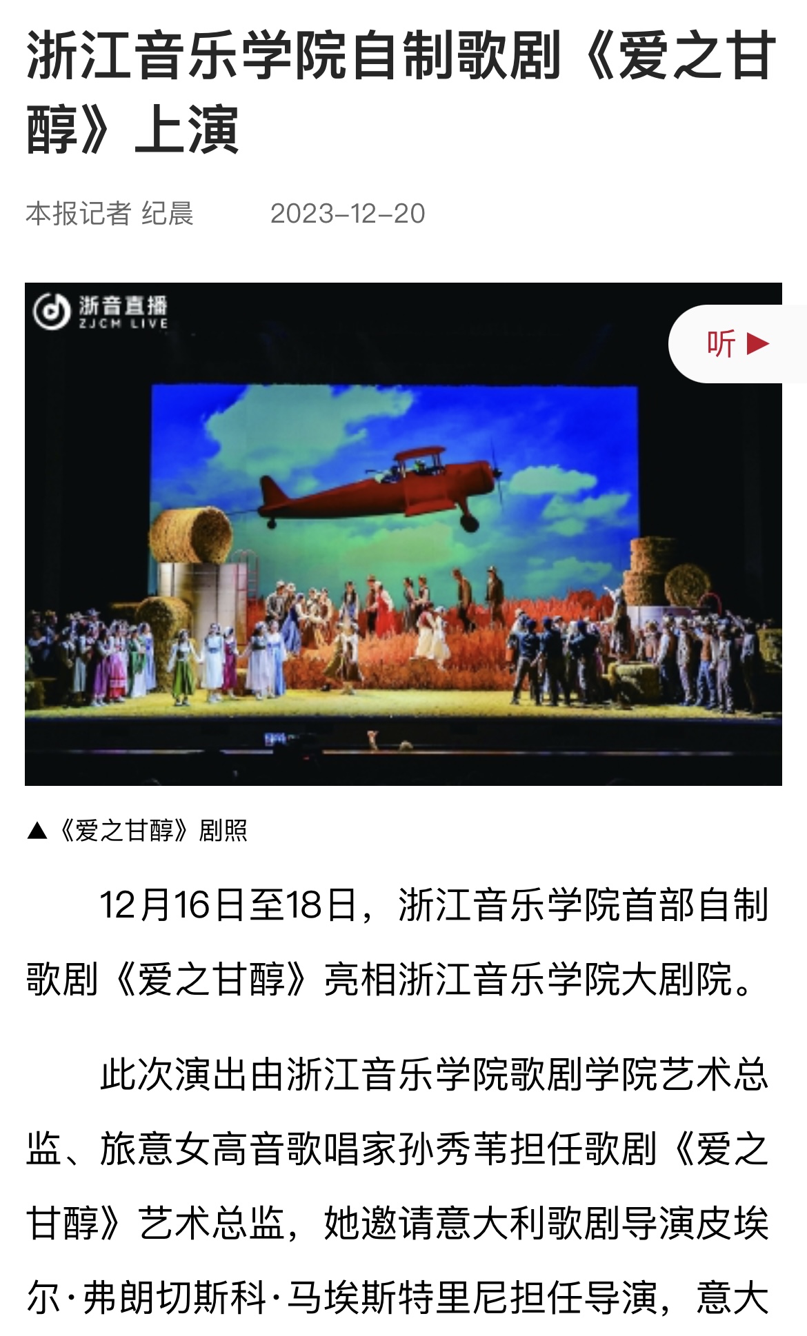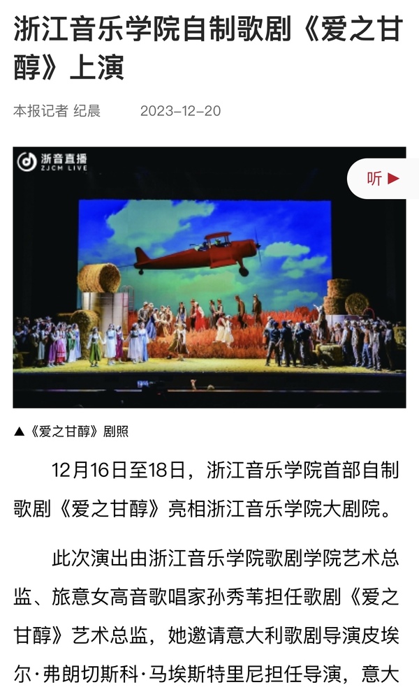 音乐周报:浙江音乐学院自制歌剧《爱之甘醇》上演