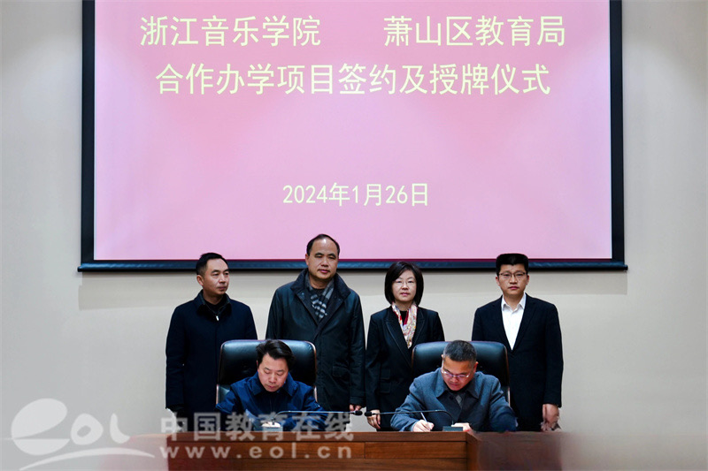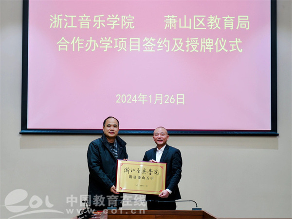 会上,浙江音乐学院与萧山区教育局签订合作办学协议书,萧山五中被授牌“浙江音乐学院附属萧山五中”。未来,双方将本着“合作共赢、优势互补”的原则,共同开展区域音乐教育教学研究、学生实践实习、艺术类课程研发等内容,协助萧山五中制定学校艺术发展规划,指导艺术课程建设、课堂教学改革、教师培养和学生发展等各项工作,力争通过三至五年时间,把萧山五中办成一所省市知名的艺术特色高中,实现普高学生多元发展、多途径成才,形成合作办学领域“尚学萧山”的新范式,辐射提升萧山整体的艺术教育水平。
