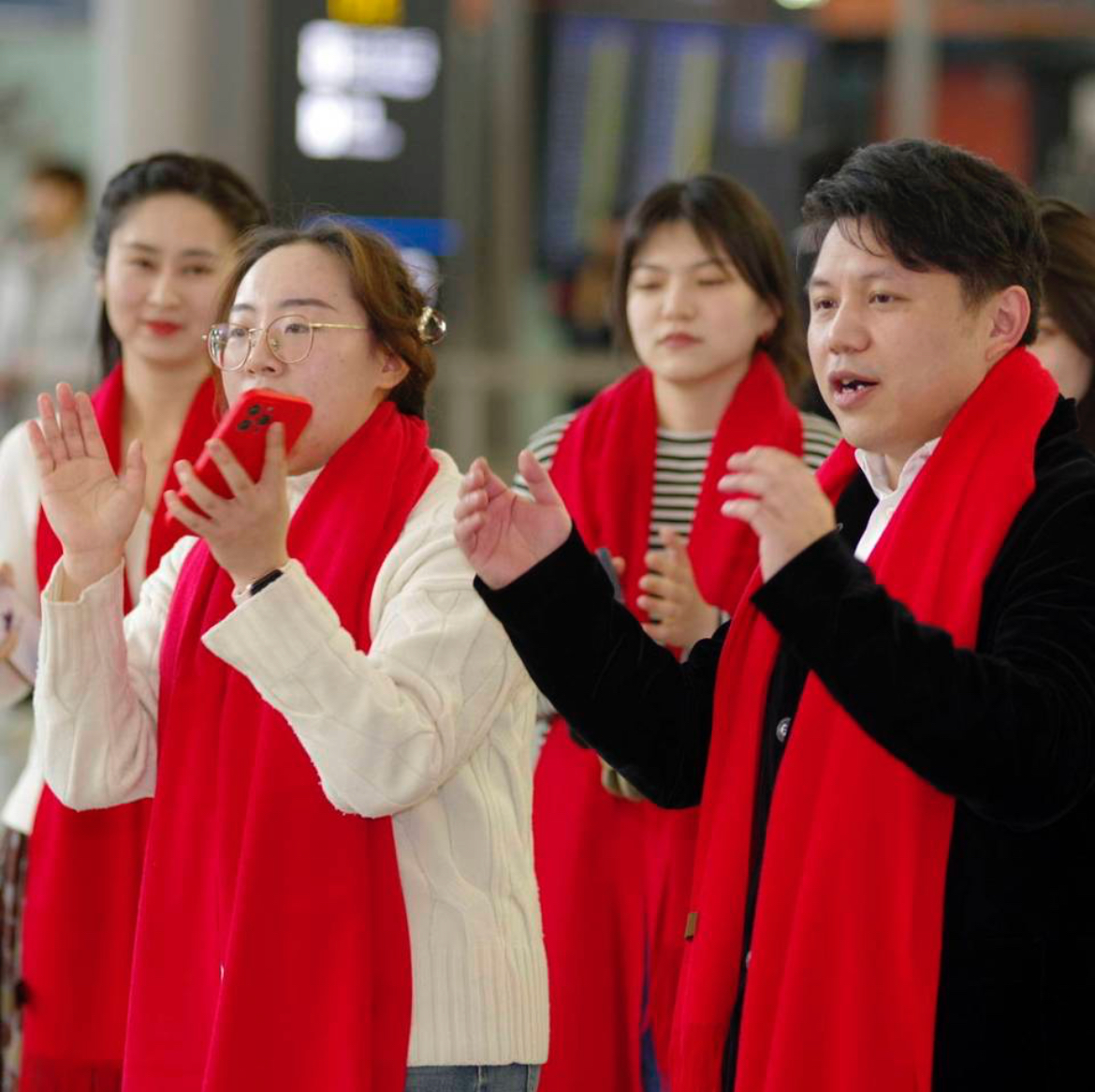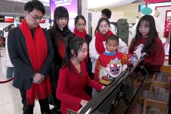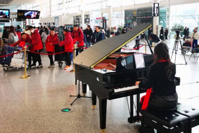 1月26日,由三位中国音乐金钟奖获得者领衔的浙江音乐学院钢琴系“文艺轻骑兵”志愿者团队来到杭州萧山国际机场,在T3航站楼值机大厅里举办了一场特别的钢琴快闪活动,他们先后演奏了《春节序曲》《茉莉花》《灯火里的中国》《彩云追月》等一首首耳熟能详的曲目,为繁忙的机场带来了浓浓的艺术气息,也让不少过往的旅客不由得放缓了脚步,感受这份春运旅途中的温暖与喜悦。