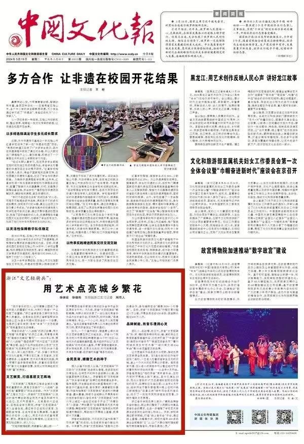 2024年3月19日,《中国文化报》头版刊发文章:《浙江“文艺轻骑兵”:用艺术点亮城乡繁花》。
