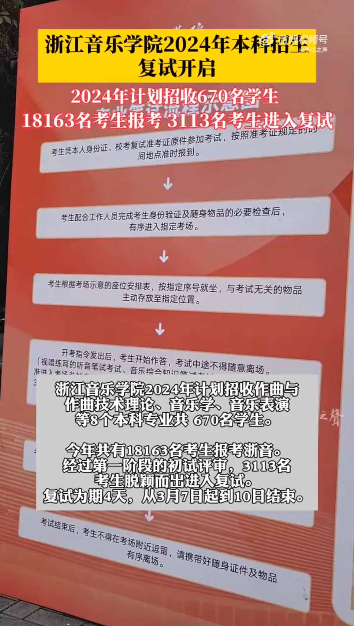 今年浙音计划招收作曲与作曲技术理论、音乐学、音乐表演、舞蹈表演、舞蹈学、舞蹈编导、表演、艺术与科技等8个本科专业共 670名学生。共有来自全国31个省、市、自治区(不含港澳台)的18163名考生报考浙音,报名人数位居前三的省份分别是:广东、浙江、山东。有7个专业方向报名人数超过1千人以上,其中报考人数最多的专业方向是音乐学(师范)专业钢琴与声乐方向,报考人数为3156名。报考人数和招生计划比例最高的专业方向分别是表演(戏剧影视表演)专业方向,考生为2921名,报考比例为146:1。经过第一阶段的初试评审,共有3113名考生脱颖而出,进入复试。复试为期4天,从3月7日起到10日结束。