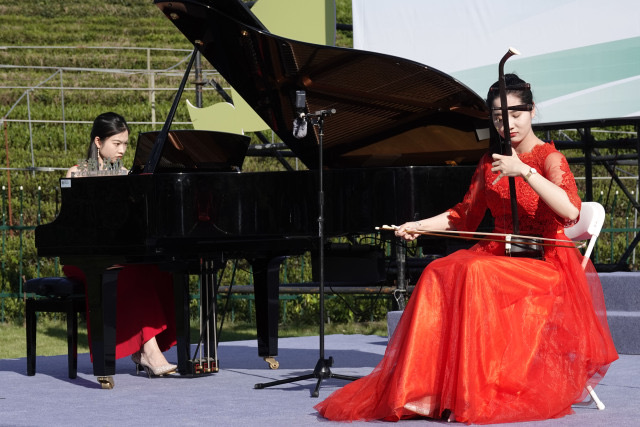 乐声袅袅,茶香阵阵。昨天傍晚,在茶园被夕阳笼罩之际,一场别致的草坪音乐会在西湖区转塘街道何家村浪漫上演,来自浙江音乐学院的师生们以钢琴演奏、歌曲联唱、舞蹈表演等形式,为当地村民带来高雅艺术的视听享受。