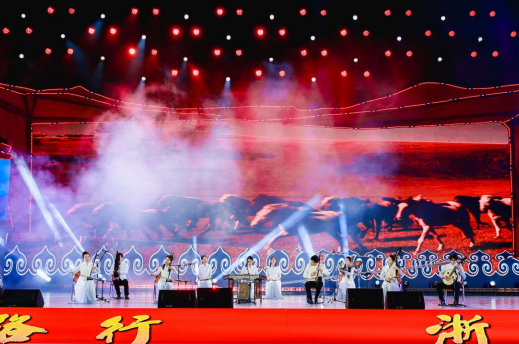 随着优美的曲调响起,江南女子踏石而行,在碇步桥上缓缓走来,一群身着淡雅旗袍、手持采茶篮的民歌手登场,呈现一幅江南采茶图。灯光一转,一股来自草原的粗犷气息扑面而来,舞者们手持马鞭,演绎着赛马、摔跤等那达慕大会上的传统项目。观众们仿佛穿越时空,在西子湖畔的柔美与柴达木盆地的壮阔间自由穿梭,感受两地文化的碰撞与交融。