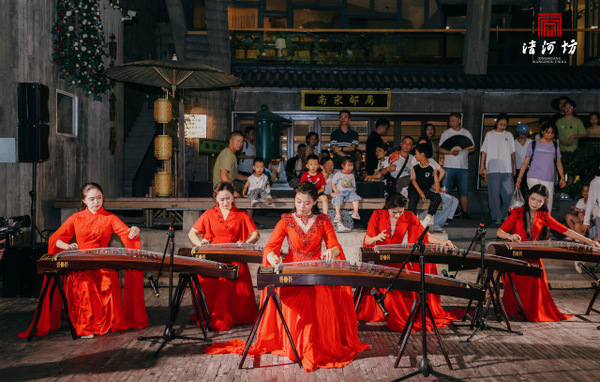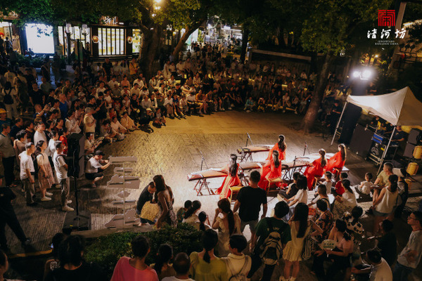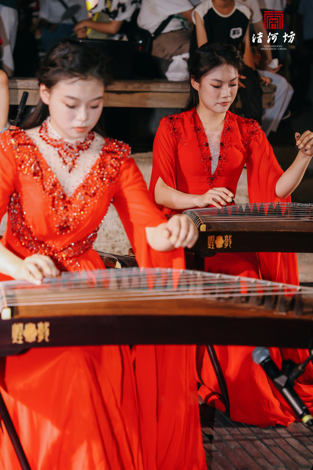 这个七夕夜,鼓楼小广场的弧形观众席上人头攒动。作为清河坊“夏夜漫游”的系列活动之一,浙江音乐学院MTC筝团带来了一场国风雅韵专场音乐会。
