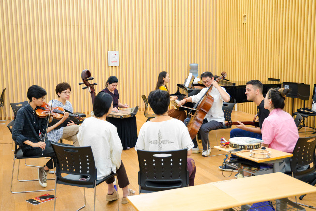 工作坊以导师小组课形式为主体。在导师的引导下,漂洋过海的国外青年音乐家怀抱班卓琴、乌德琴、卡挵,与琵琶、二胡、箜篌等中国传统乐器,共同创作、即兴演奏,导师则传授不同文化背景下的音乐知识和技巧。