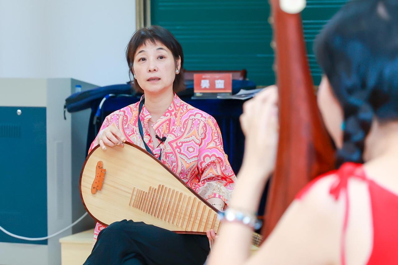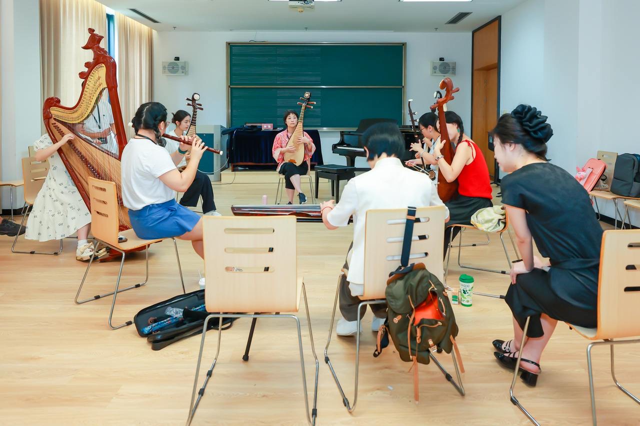 排练室里,6个学员围坐一圈,她们各自准备好手中的乐器:琵琶、古琴、箜篌、笛子,一起看向这堂课的导师——著名琵琶演奏家、浙江音乐学院特聘教授吴蛮。