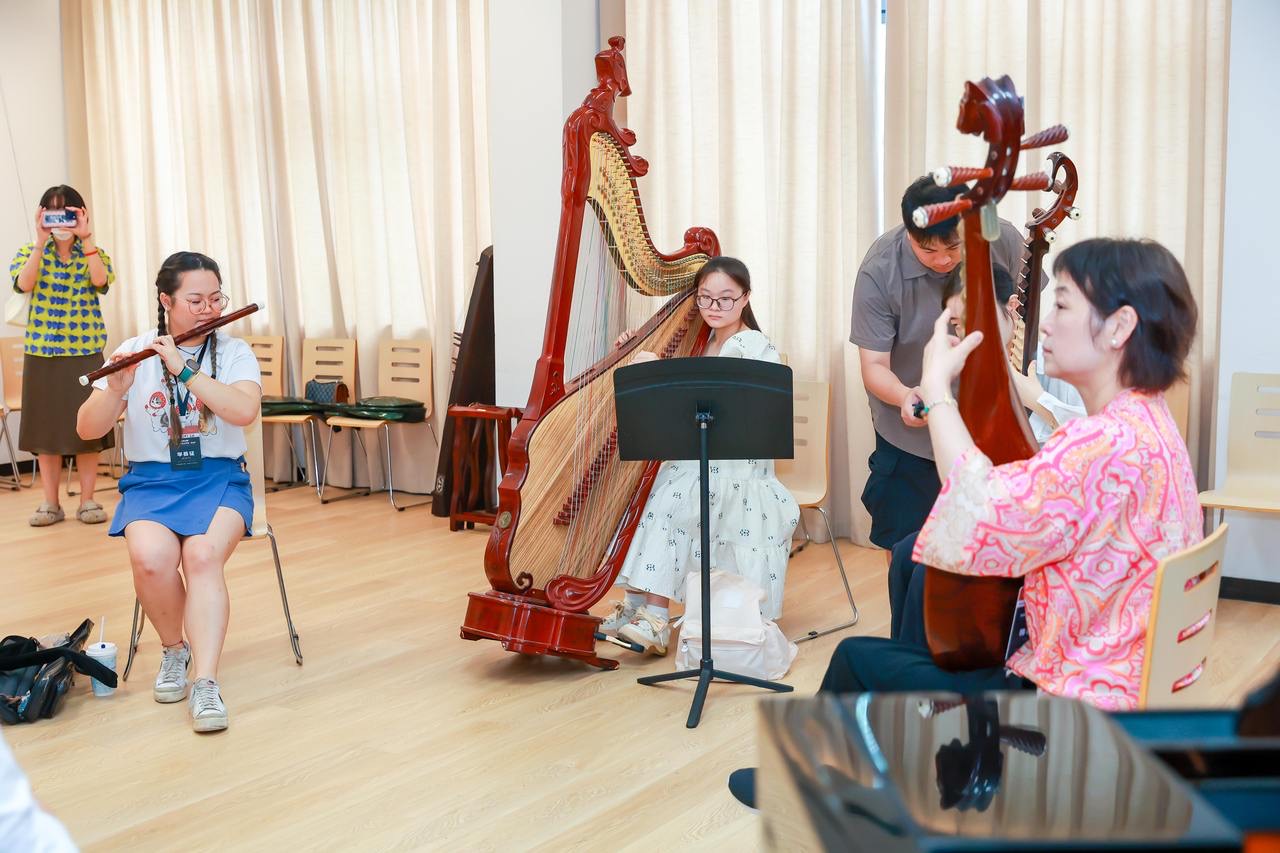 在排练室里围坐一圈,从吴蛮右手边的学员开始自我介绍。因为是民乐小组,其中5个学员来自国内辽宁、湖南、浙江等地,还有一位来自美国。三个人拿的是琵琶,还有一架箜篌、一架古琴、一管笛子。他们要在吴蛮的指导下,排出一个节目,在四天后的音乐会上演奏。