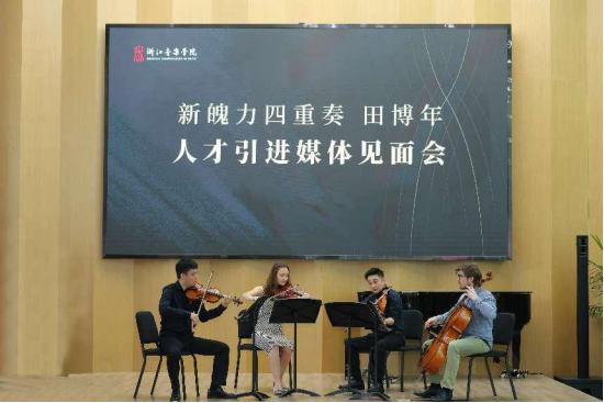 9月19日上午,新魄力四重奏组合、田博年人才引进媒体见面会在浙江音乐学院教师发展中心举行,当今新生代弦乐四重奏中最出类拔萃的重奏组之一新魄力四重奏与著名华人大提琴演奏家田博年教授正式加盟浙江音乐学院。现场,浙江音乐学院院长王瑞为驻院艺术家团队新魄力四重奏、新引进艺术家田博年颁发聘书。这一历史性的合作,不仅标志着浙江音乐学院发展历程中的一个重要里程碑,更是对“人才培养+艺术实践”创新模式“2.0版”华丽升级的最佳诠释。