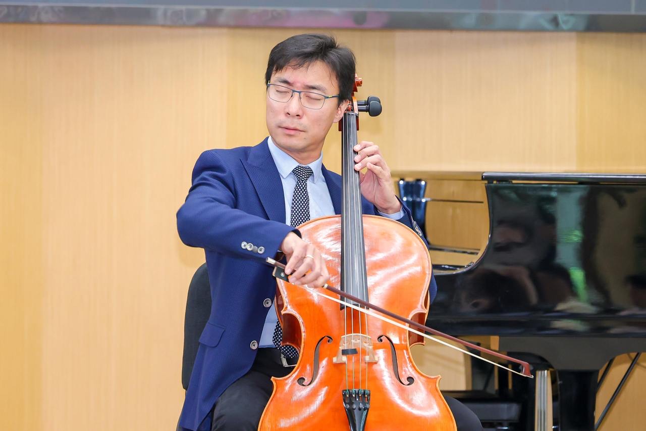 紧接着,著名华人大提琴演奏家田博年教授上台,他挪开谱架,闭上眼睛,悠扬的乐声从琴弦溢出。作为大提琴演奏领域的杰出代表,田博年回归国内受聘于浙江音乐学院特聘大提琴全职教授。