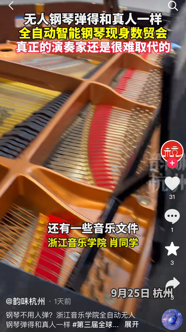 新闻来源:1.53 复制打开抖音,看看【韵味杭州的作品】钢琴不用人弹?浙江音乐学院全自动无人钢琴弹得和真人... https://v.douyin.com/iknJv7Uk/ S@l.CH 12/08 qeb:/