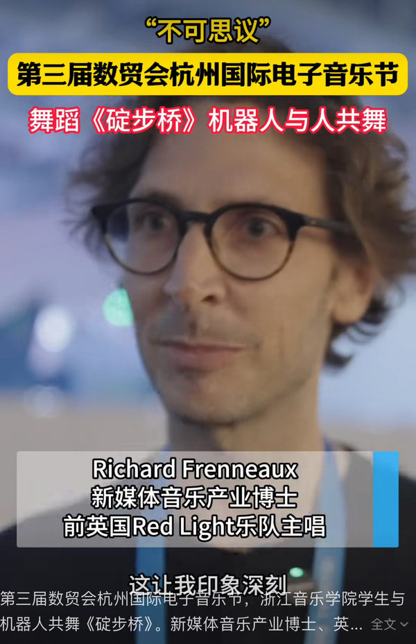 中国蓝国际:第三届数贸会杭州国际电子音乐节,浙江音乐学院学生与机器人共舞《碇步桥》。新媒体音乐产业博士、英国Right Red乐队前主唱Richard Frenneaux 看后觉得: 不可思议。