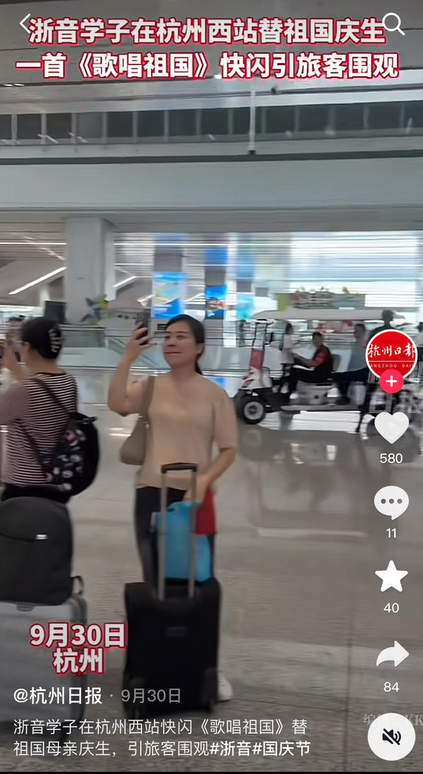 杭州日报:浙音学子在杭州西站快闪《歌唱祖国》替祖国母亲庆生,引旅客围观