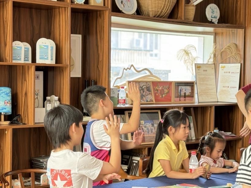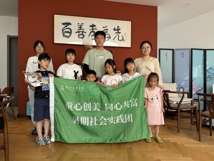 基于这一背景,团队成员前往杭州市慈母桥村开展了一项以“童心创美·同心共富”为主题的美育实践项目,团队成员化身“童创导师”的身份,带领乡村儿童拓宽审美视野、助力乡村文化振兴、推动乡村物质与精神共富的坚实力量。项目负责人朱惠强介绍道,“我们以引导者的身份带领孩子在日常生活与传统文化中感受美、表达美、创造美,希望将美育理念融入日常生活,将创意渗透地深入人心。”本次在慈母桥村的项目实践不仅是“艺术村长”机制的辐射与带动儿童美育的行动指南,更是铸牢乡村美育振兴的创新路径与实践之路。在关注乡村物质富裕的同时,注重精神文化的提升,通过深化美育实践,激发乡村儿童的创新潜力,为乡村振兴注入新的活力。